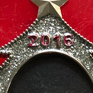 This is a sturdy Studio Decor Christmas Tree shaped Ornament Frame with an Enameled glitter into the Silver Tree Date is 2016 in Red. It opens in the back to insert Photo.