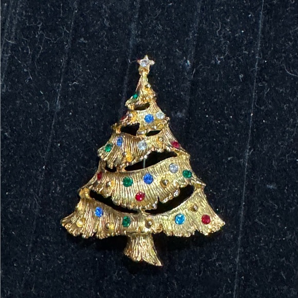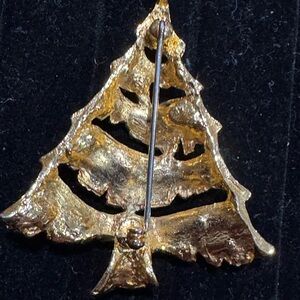 Gold tone 5 tier Christmas tree brooch featuring rhinestones and gold ball decorations. There is one rhinestone missing from the bottom layer (see pictures). This is a great festive brooch for the holidays!