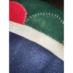 Christmas Tree Skirt Mushroom Houses 52 Felt Appliqué Handmade Phallic vintage folk art whimsical forest Excellent condition with the exception of green color transfer on 1 spot and a mark on another. Its not easy to see unless up close. The hook and eye closures are a bit rusty but they can easily be replaced at some point but still function as they should. Beautiful piece of handmade art to display at the holidays