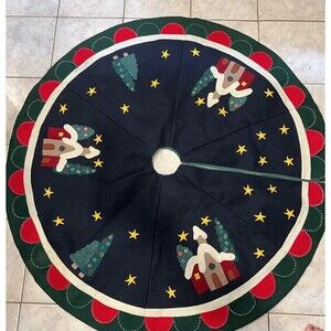 Christmas Tree Skirt Mushroom Houses 52in Felt Appliqué Handmade Vintage Folkart