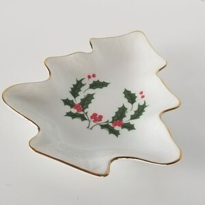 Christmas Tree Trinket Candy Dish Holly Berry Design Japan 6 inch Holiday