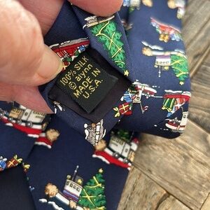 Christmas Silk Neck Tie By Eric Hulch for Alynn Neckwear. 100% silk. Made in USA. “Christmas Tugs” design: tug boats with Christmas presents and trees on navy background. Excellent conditon. 3 3/4” wide