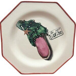 Gorgeous, Holiday Lane, Christmas, holidays ,salad/dessert plates with whimsical design of shoes decorated in holiday theme. Ivory color plates with red trim. Octagon shaped plate.