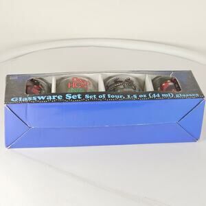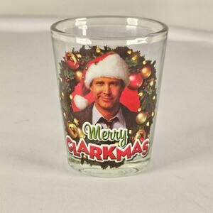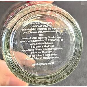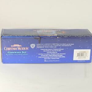 Set of 4 National Lampoon's Christmas Vacation shot glasses by Silver Buffalo. Each glass features a different design including Clark Griswold and iconic holiday quotes from the film. Capacity: 1.5 oz (44 ml). Original box included (some wear to box).