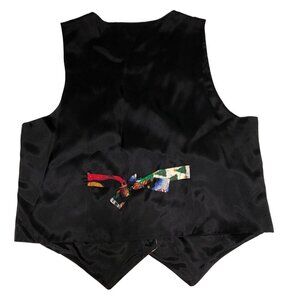 Fun holiday vest button front in printed cotton blend. Back is acetate with an adjustable tie. Size tag is missing. My best guess is this a vintage size medium or large. Please refer to measurements in photos to ensure this will fit you.