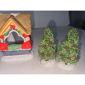 Christmas Village Doll Maker Boy In Gazebo Poinsettia Gazebo 2 Trees 5 Pieces!