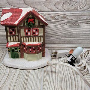Christmas Village Illuminated House Home Lighted Windows Red Roof Wreath Vtg