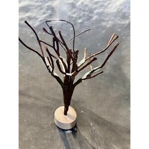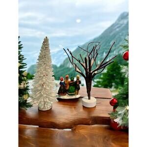 Miniature accessories trio for your winter village display: a hand-painted carolers figure, a snowy white bottle-brush tree, and a bare wire tree on a wood base. Bottle-brush trees became holiday staples in the mid-20th century and later accompanied the collectible village scenes popularized by brands like Department 56 (1970s–) and Lemax (1990s–). This set dates to c. 1990s, typical of imported village accessories made in China. Sizes: carolers 2.25"H x 2.1"W; bare tree 4.5"H x 3"W; white tree 5"H x 2"W. Perfect for mantel scenes, tiered trays, or cottage and traditional décor.