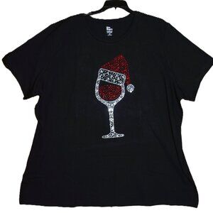 Christmas Wine Glass Rhinestone Bling black short sleeved Vneck shirt.