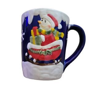 The tan mug has a santa bear and christmas