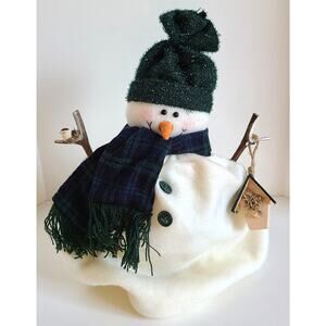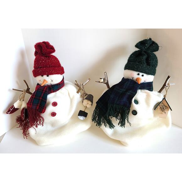 Really cute matching pair of "country chic" snowmen crafted from fabric and felt. Each are approximately 11" high x 8" wide and both feature a small, cylindrical sandbag hidden in the middle to keep them upright, ensuring they stay in place. The fabric all around on the bottom is draped and moveable, allowing you to rearrange it to suit your taste. Snowman with the red plaid scarf holds mittens and a bucket of snowballs with a shovel. Snowman with the green plaid scarf holds a small bird in a nest and a birdhouse. Both are in like new condition with no rips, tears, stains, snags, pilling or other blemishes.