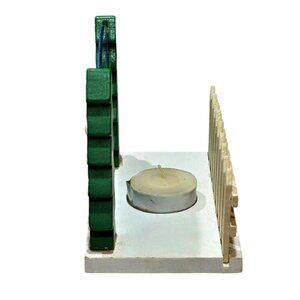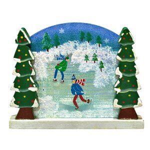 Christmas Winter T-Lite Holder Ice Skaters Wooden Vintage Ewes View w Lite & Box