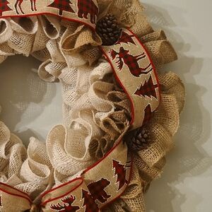 Made on a wire wreath form Featuring a beautiful combination of white, brown, and red colors, this wreath is made of artificial materials, which means you can enjoy it year after year. The wreath is adorned with a buffalo plaid ribbon, pine cones, and bells. The Christmas ribbon features a moose, a bear, and a Christmas tree, giving it a cozy farmhouse feel.