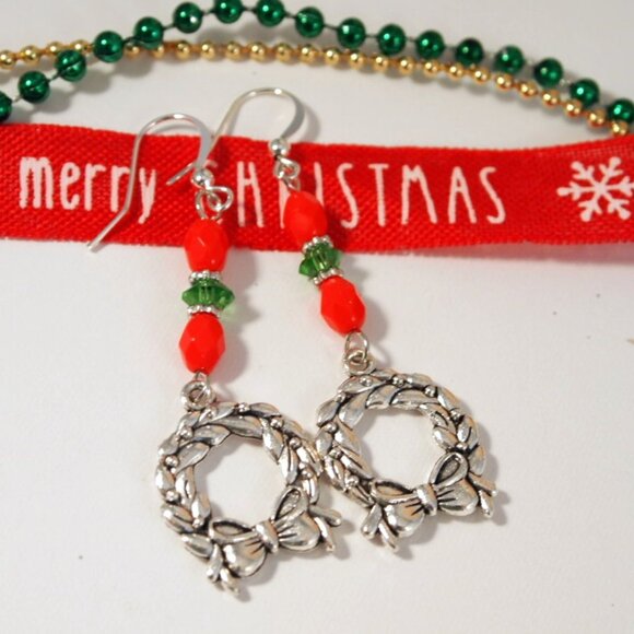 Christmas Wreath Earrings Dangle Pierced or Clip-on Earrings Silver Earrings