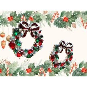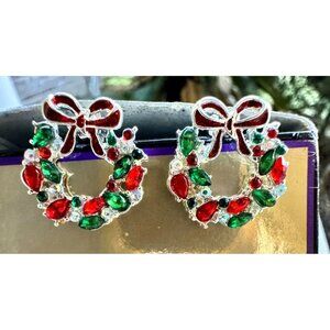 Christmas Wreath Earrings New Red Green Clear Crystals Posts Festive Bow…