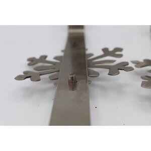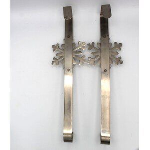 This set of 2 metal Christmas wreath holders is adorned with snowflakes, perfect for winter-themed decor. At 14 inches long and 3.75 inches wide, they effortlessly hang over doors. Note: some wear on the metal.