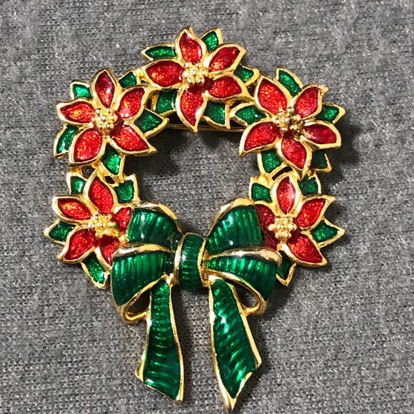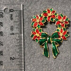 Vintage Christmas Wreath Poinsettia Pin Brooch Beautiful Design Green Gold Red. Please see pictures for more detail. We also have other vintage brooches pins available.