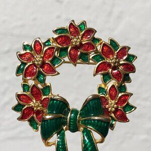 Christmas Wreath Poinsettia Pin Brooch Beautiful Design Green Gold Red