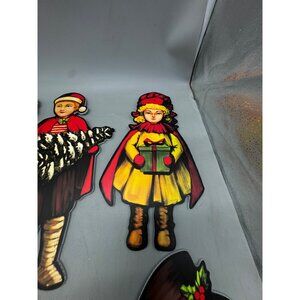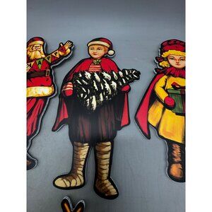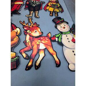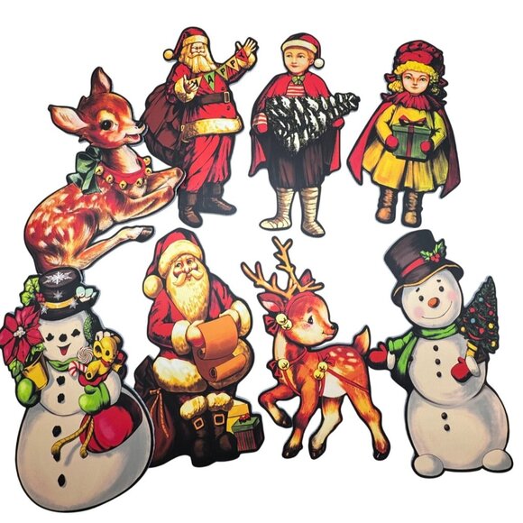 This set of eight vintage die-cut cardboard decorations showcases classic Christmas characters, ideal for enhancing seasonal ambiance in homes or festive displays.