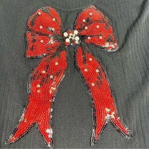 This is a one size, super stretchy, polyester spandex fabric with a red Christmas bow on the front that a sequined and has beads. Photos also contain measurements. This is an excellent preowned condition and comes from a smoke free home and will be mailed out same day.