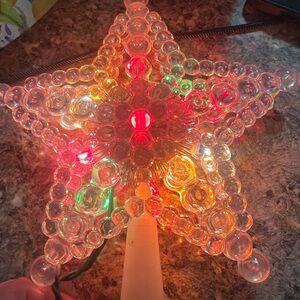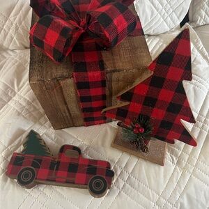 Festive Christmas tree skirt with a red plaid ruffle and star accents. Features 'Merry Christmas' text.