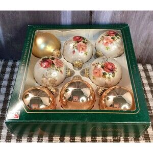 These Christmas ornaments by Krebs are hand decorated with glitter and roses, featuring a Victorian style design in multiple colors. Made of glass and measuring 2.25 inches in height, they come in a set of 8 round ornaments perfect for the holiday season. Each ornament is adorned with a floral pattern or gold and reflects a charming, vintage aesthetic that brings a touch of elegance to your Christmas decor. Made in Germany, these ornaments are a timeless and beautiful addition to any holiday display.