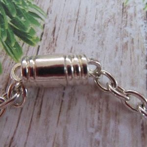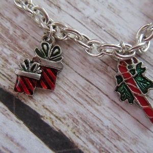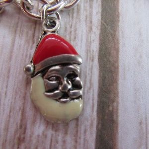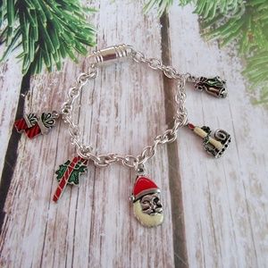 Christmas charm bracelet magnetic close-Santa, candle,bells,candy canes,presents. Cute Christmas charm bracelet measures 7 1/2" and closes with a magnetic clasp. Easy to put on and take off! Painted enamel charms are in perfect condition. Metal bracelet and charms are silver tone.