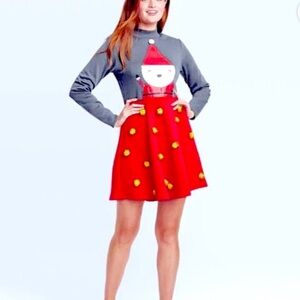 fit and flare long sleeve skater Christmas dress in red and gray fleece lined embellished Santa XS, L