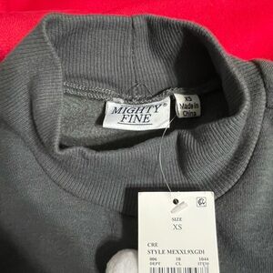 Cute and cozy long sleeve skater Christmas dress in red and gray fleece lined sweatshirt type fabric embellished with a cute, friendly Santa on the bodice and golden pom poms on the front of the skirt, ribbed mock turtleneck. White pom pom on top of Santa's cap, too! Such a comfy, fun dress for the holidays to keep you warm!