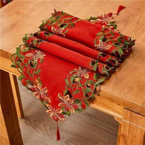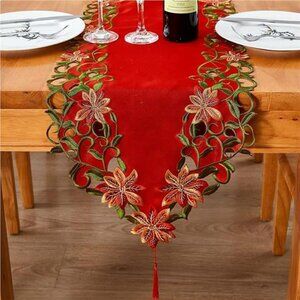 Christmas embroidered table runner red poinsettia green leaves holiday decor 69
