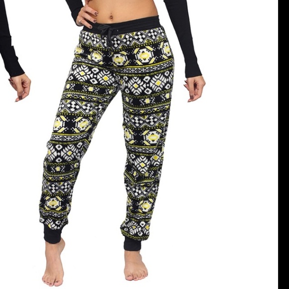 Cozy and colorful, these fleece joggers type pajamas are the perfect accessory for celebrating at home. Holiday print, ultra soft fleece fabric, drawstring waistband, ribbed cuffs, cotton/polyester blend.