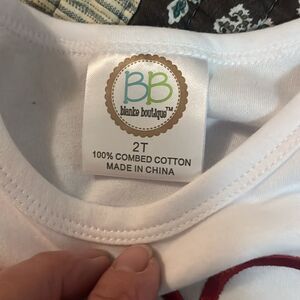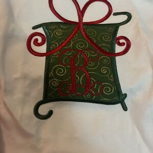 Christmas size 2 pants set from a boutique the initial B monogrammed on the front long, sleeved white shirt. The pants are red with gold, dots, and green bellbottoms at the bottom that match the shirt new without tags never worn.