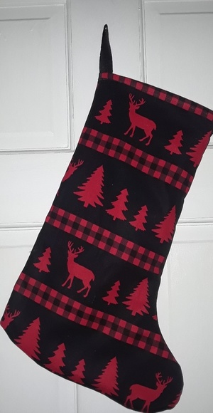 Home made brand new stocking for the holidays Pattern is deer and trees Color are black and red 100 % cotton 100 % cotton black lining 17x7 inches