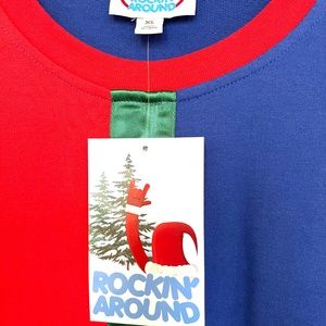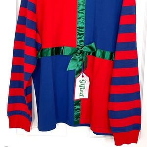 This beautiful sweat shirt is an XL with a gift wrap design with the green ribbon and bow in the center and stripped sleeves with a cuff.