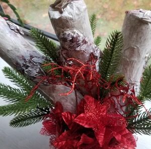 Christmas table decor w/faux logs and pine stems. handcrafted in pot