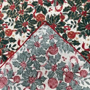 Christmas tablecloth cream red green holly & ornaments machine finished 69 x 52