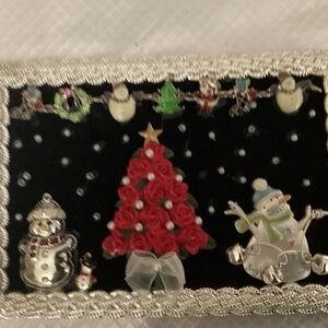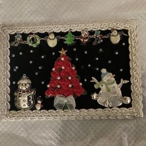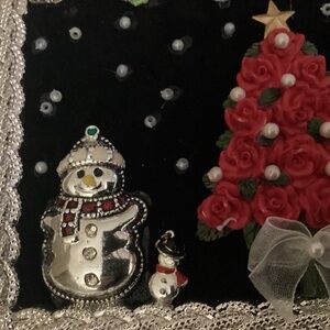 Christmas time jewelry art display red ceramic poinsettia snowman silver frame