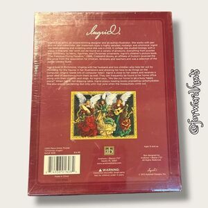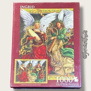 This Christmas Angels glitter jigsaw puzzle by Ingrid, manufactured by Andrews & Blaine, is a beautifully detailed puzzle featuring two angels, one playing a mandolin and the other a harp. A smaller version of the same image is displayed in the bottom left corner of the box.