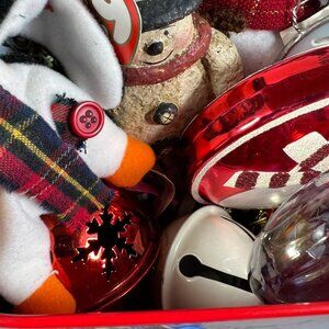 Christmas-Themed Gift Basket Full Of Snowman & Holiday Ornaments In Red Plaid Ti