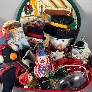 Celebrate the season with this charming holiday basket featuring whimsical snowmen and festive ornaments, all nestled in a plaid tin for gifting.