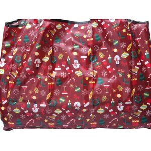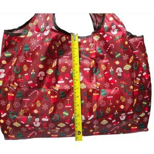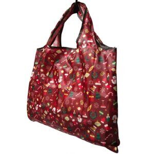 This item is a foldable, reusable Christmas-themed shopping bag. Made from durable, lightweight, and water-resistant Nylon material that is a popular eco-friendly alternative to single-use bags. Can be folded into a small pouch or an inner pocket for portability