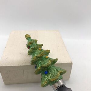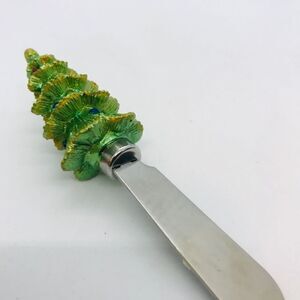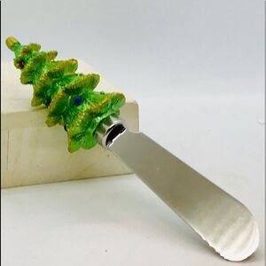 Butter knife for Christmas holiday to decorate and use for Xmas celebrations. Green tree made from resin & set with red, blue & yellow rhinestones. Knife is stainless steel.