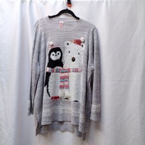 gray and white with silver metallic throughout, Christmas sweater. longer in the back
