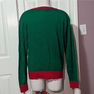Christmas sweater ugly sweater green red polka dots. teddy bear present gift box print "nice" stockings print sweater