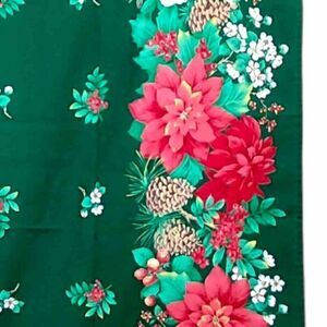 Pre-owned long rectangular Christmas tablecloth beautiful green background with red poinsettias. Measures 54 in by 57 in Long