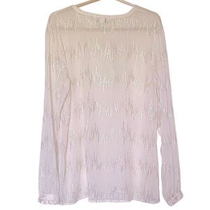 Christopher & Banks Elegant Ivory Semi Sheer Satin Blouse with Sparkling Silver Accents Long Sleeves Henley Collar Button Closure Relaxed Silvery Detail