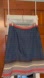 Stylish denim skirt with vibrant red and brown stripe accents. A-line design for a flattering fit. Ideal for casual wear. See photos for measurements.