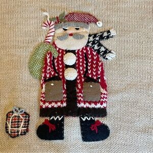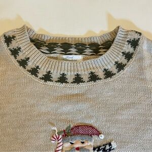 Christopher & Banks Christmas Sweater featuring a Santa Claus design with embroidered details including a candy cane and present. The sweater is a vintage-style pullover with a beige knit and Christmas tree pattern along the neckline and cuffs.