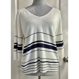 This Christopher & Banks sweater is a stylish addition to your wardrobe. The blue striped pullover features a flattering v-neck and 3/4 sleeves, making it perfect for any occasion - from travel to casual wear. The sweater is made of a comfortable blend of ramie and cotton knit fabric, ensuring that you stay cozy all year round.