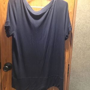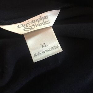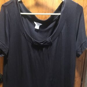 Christopher & Banks brand women’s solid navy short sleeve tee top in size XL. Round neckline with solid bow accent in front. Hemline has a 4” wide solid band. Comfy rayon and spandex blend. Showing photos of front and back sides along with fiber contents and care information.